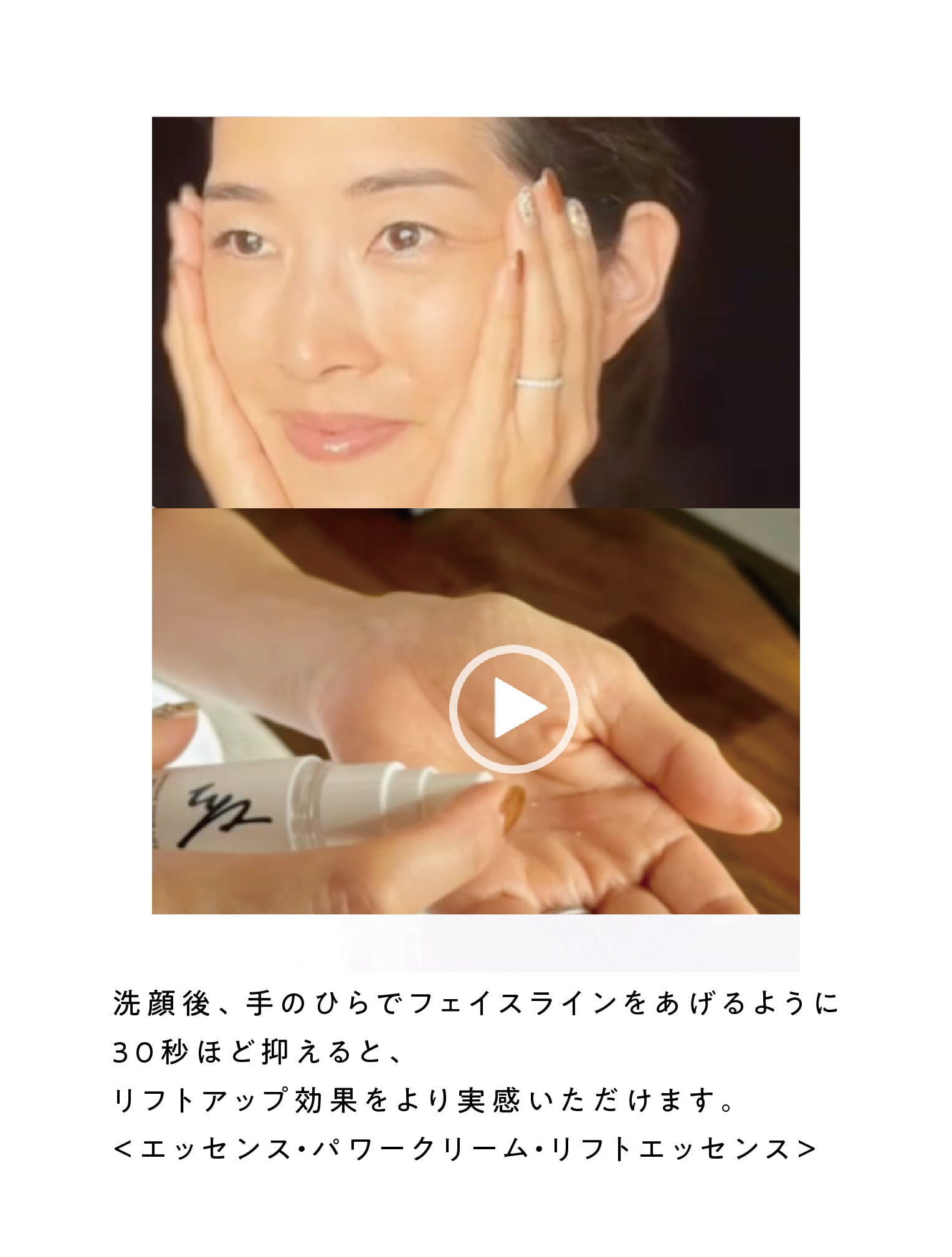 <リジュアップの効果的な塗り方>洗顔後、手のひらでフェイスラインをあげるように30秒ほどおさえるとより効果的です。