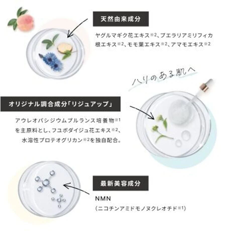 【全成分】水、アウレオバシジウムプルランス培養物、PG、ナイアシンアミド、ケイ酸(A I/Mg)、ケイ酸Na、マスチック樹脂、グリセリン、ダマスクバラ花水、ヒアルロン酸 Na、リン酸アスコルビルMg、アスコルビルリン酸Na、アデノシン、ニコチンアミドモノヌクレオチド、水溶性プロテオグリカン、アマモエキス、セイヨウオトギリソウ花/葉/茎エキス、カミツレ花エキス、トウキンセンカ花エキス、フエボダイジュ花エキス、ヤギルマギク花エキス、ローマカミツレ花エキス、アロエベラ葉エキス、モモ葉エキス、アラントイン、グリチルリチン酸2K、トリ(カプリル酸/カプリン酸)グリセリル、キサンタンガム、レシチン、水添レシチン、ポリソルベート80、BG、ベンチレングリコール、1,2-ヘキサンジオール、エチルヘキシルグリセンリン、カプリル酸グリセリル